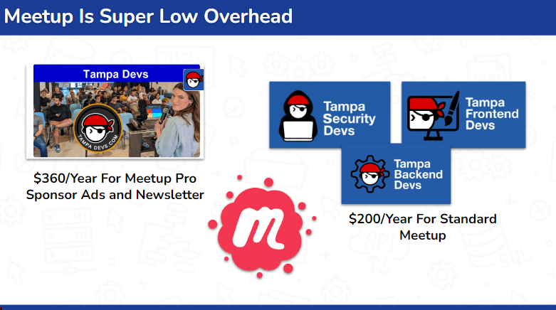 The actual expenses we incur to run Tampa Devs are fairly low. For instance, we pay $560 annually for Meetup since we run two separate accounts.