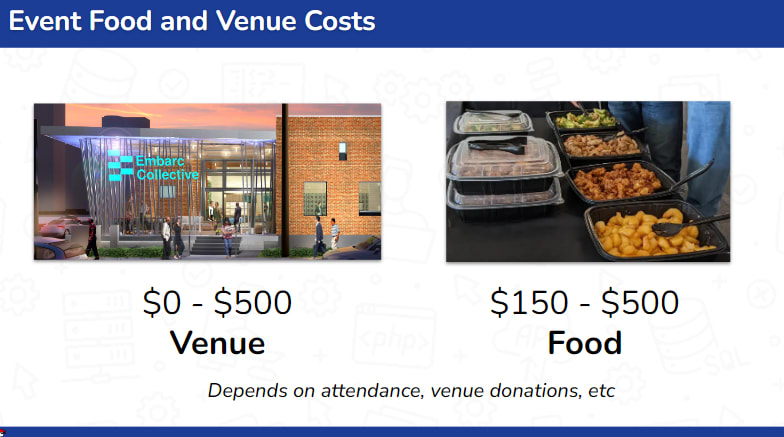 Food and venue costs varies between $0 to $500 each. However, we've been having HCC (Hillsborough Community County) be super awesome in granting their venue in kind over in Ybor. Thank you Lynn for being awesome!